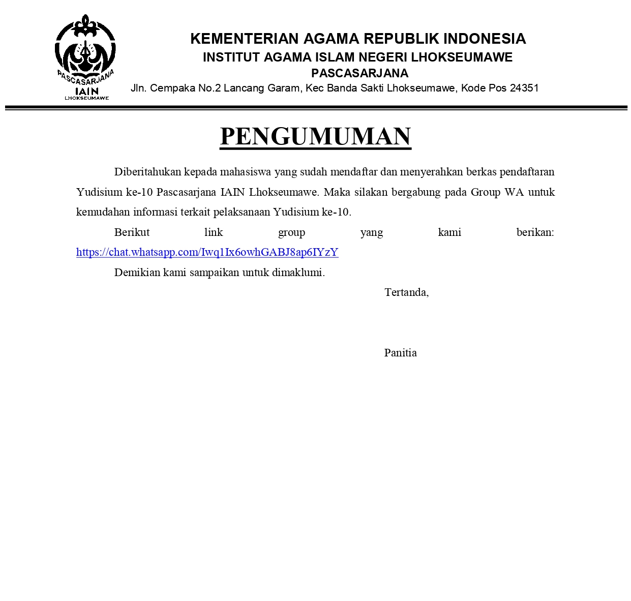Diberitahukan kepada mahasiswa yang sudah mendaftar dan menyerahkan berkas pendaftaran Yudisium ke-10 Pascasarjana IAIN Lhokseumawe. Maka silakan bergabung pada Group WA untuk kemudahan informasi terkait pelaksanaan Yudisium ke-10.
