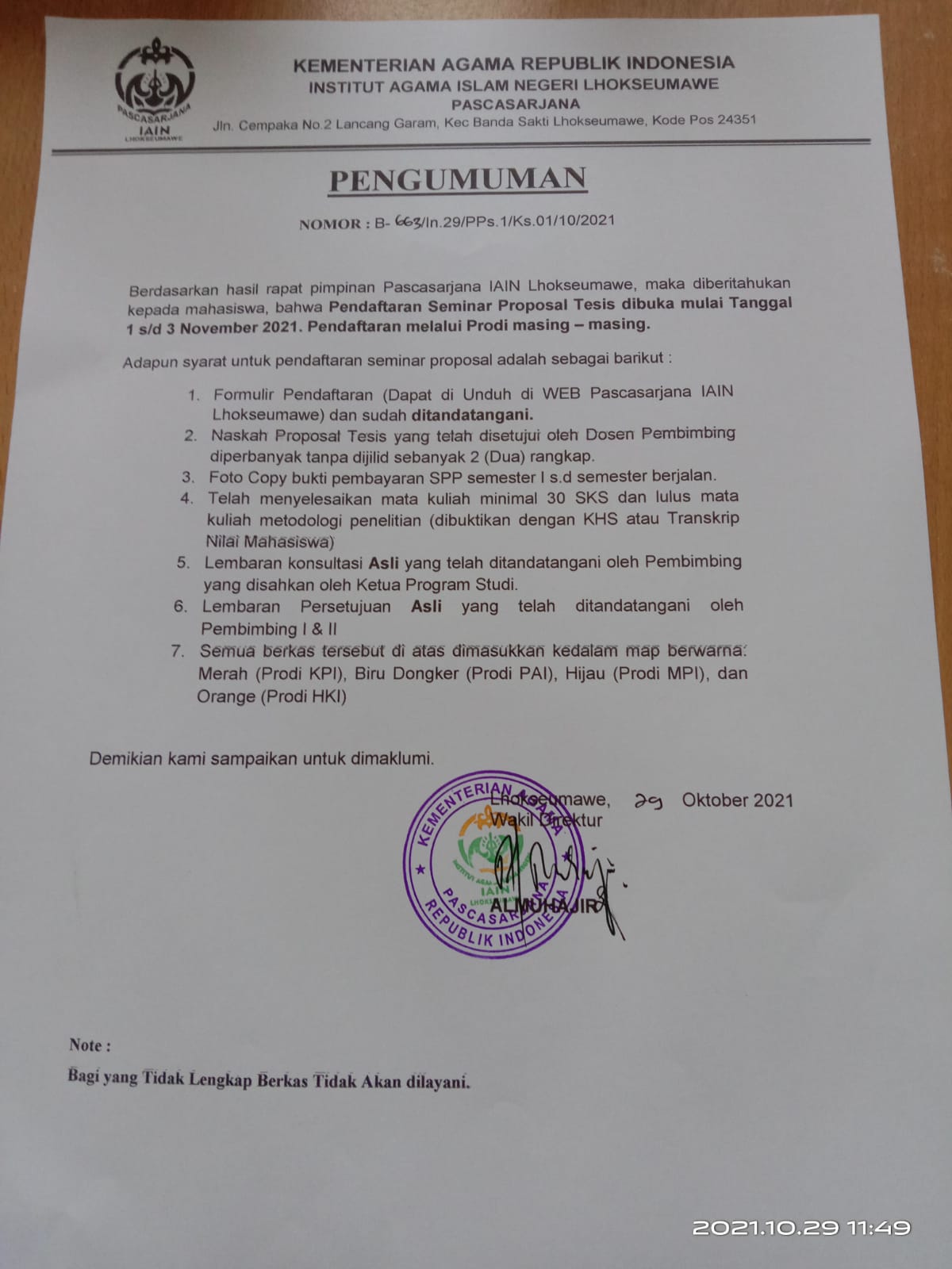 Berdasarkan hasil rapat pimpinan Pascasarjana IAIN Lhokseumawe, maka diberitahukan kepada mahasiswa, bahwa Pendaftaran Seminar Proposal Tesis dibuka mulai Tanggal 1 s/d 3 November 2021. Pendaftaran melalui Prodi masing – masing.