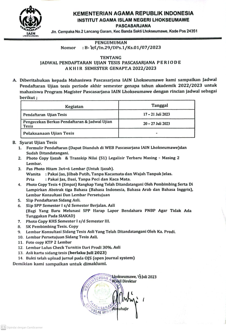 Sehubungan dengan akan berakhirnya semester genap 2022/2023, Berikut kami informasikan kepada mahasiswa program Magister (S2) IAIN Lhokseumawe tentang Pendaftaran UJIAN TESIS Untuk periode Juli 2023 dalam Semester Genap 2022/2023, jadwal pendaftaran UJIAN TESIS Periode Akhir Semester Genap Tahun Akademik 2022-2023 disampaikan terlampir.