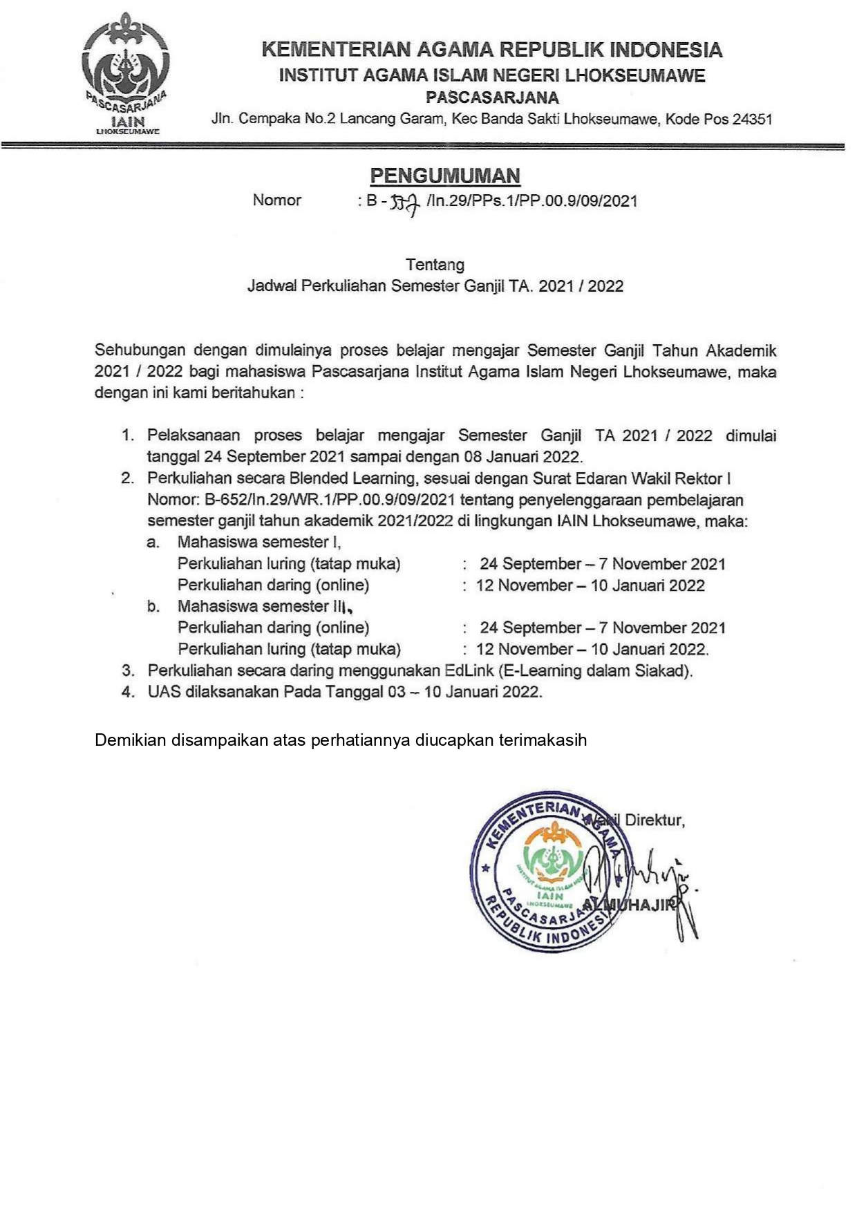Sehubungan dengan dimulainya proses belajar mengajar Semester Ganjil Tahun Akademik 2021 / 2022 bagi mahasiswa Pascasarjana Institut Agama Islam Negeri Lhokseumawe, maka dengan ini kami beritahukan :